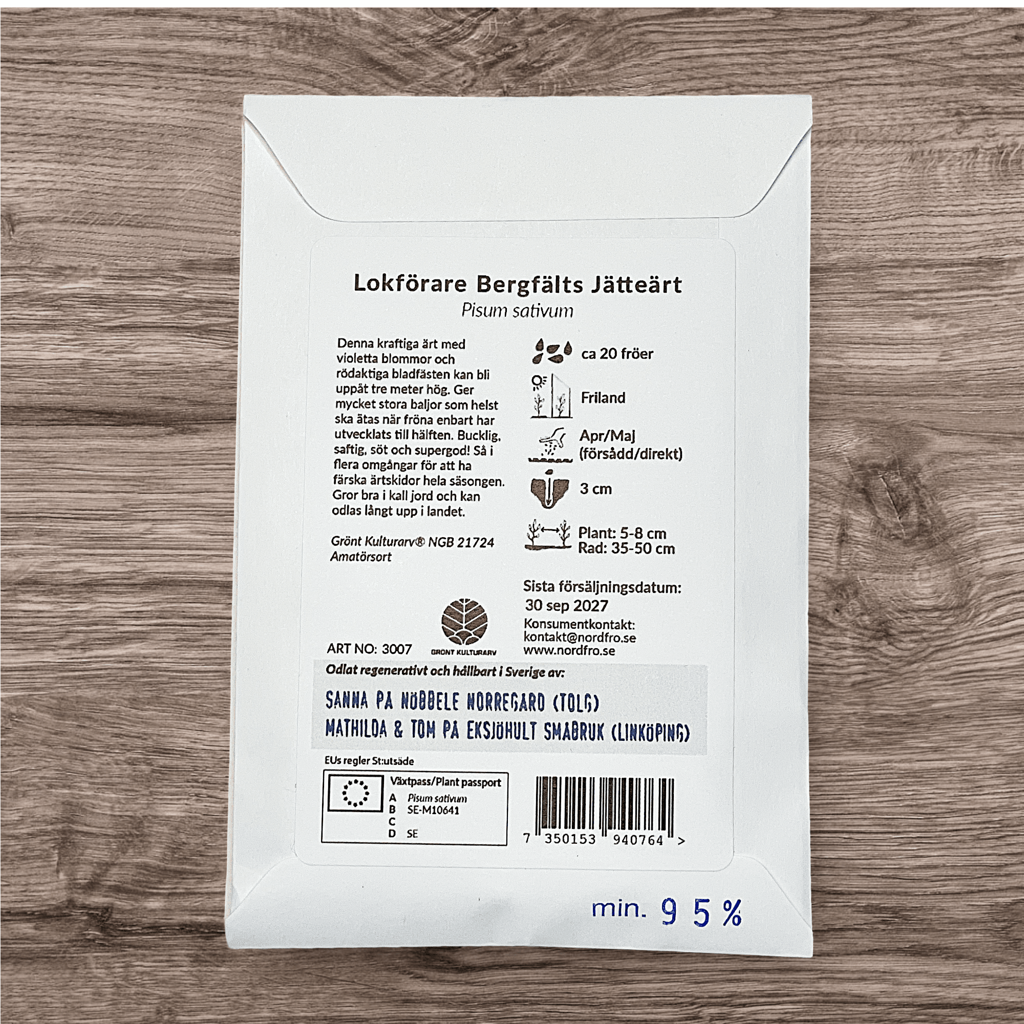 Brytsockerärt- Lokförare Bergfälts Jätteärt. Denna kraftiga ärt med violetta blommor och rödaktiga bladfästen kan bli uppåt tre meter hög. Ger mycket stora baljor som helst ska ätas när fröna enbart har utvecklats till hälften. Bucklig, saftig, söt och supergod! Så i flera omgångar för att ha färska ärtskidor hela säsongen. Gror bra i kall jord och kan odlas långt upp i landet.