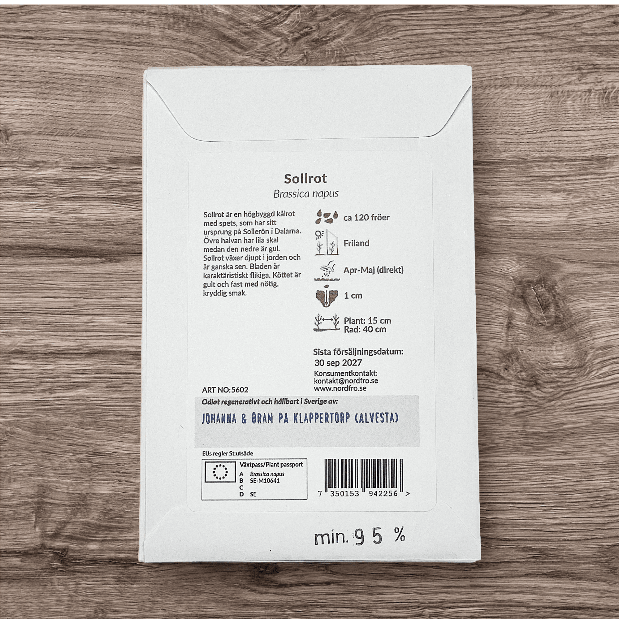 Kålrot Sollrot. Sollroten är en högbyggd kålrot med spets. ’Sollrot’ växer djupt i jorden och är ganska sen. Bladen är karaktäristiskt flikiga. Köttet är gult och fast med nötig, kryddig smak.