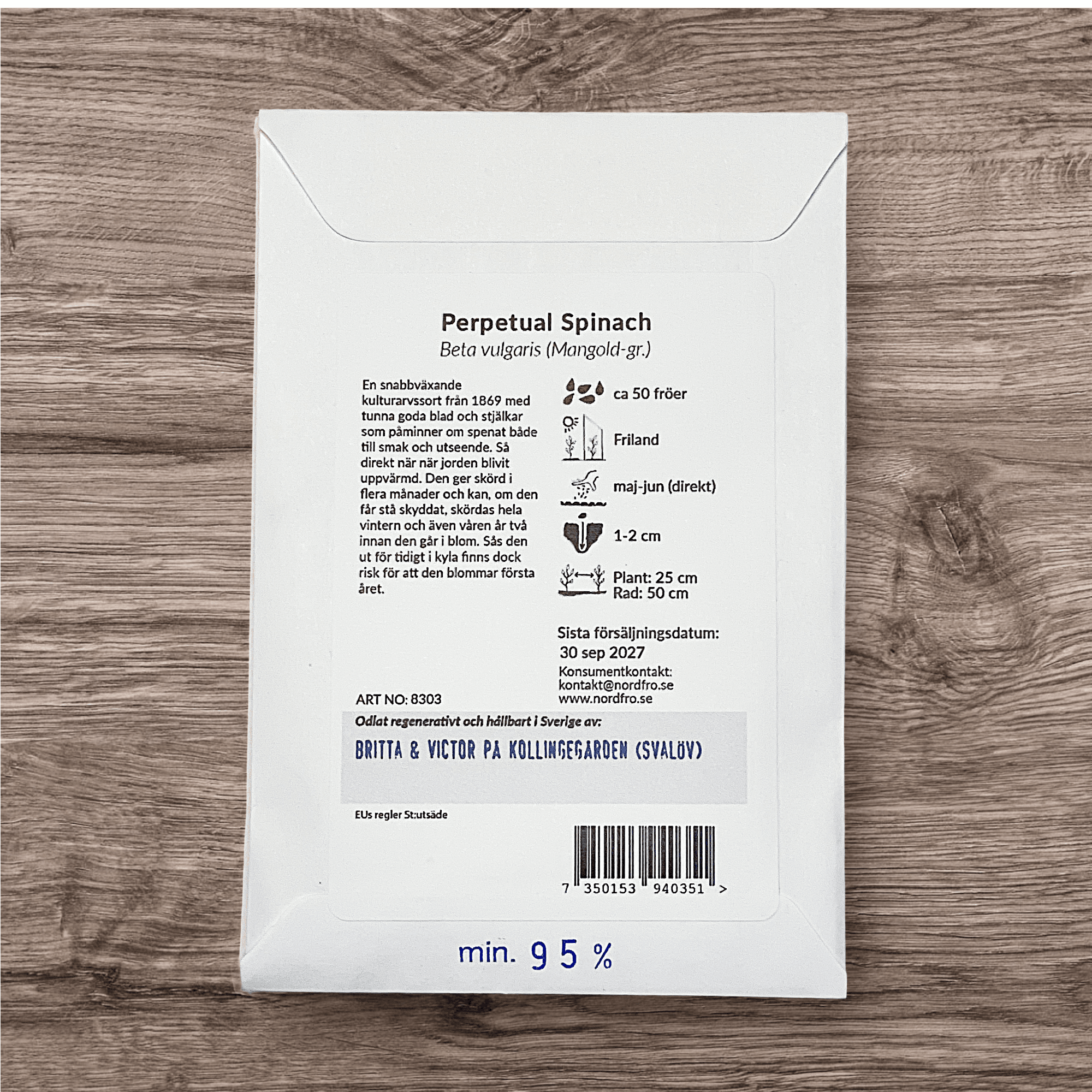 Mangold Perpetual Spinach. En snabbväxande kulturarvssort från 1869 med tunna goda blad och stjälkar som påminner om spenat både till smak och utseende. Så direkt när när jorden blivit uppvärmd. Den ger skörd i flera månader och kan, om den får stå skyddat, skördas hela vintern och även våren år två innan den går i blom. Sås den ut för tidigt i kyla finns dock risk för att den blommar första året.