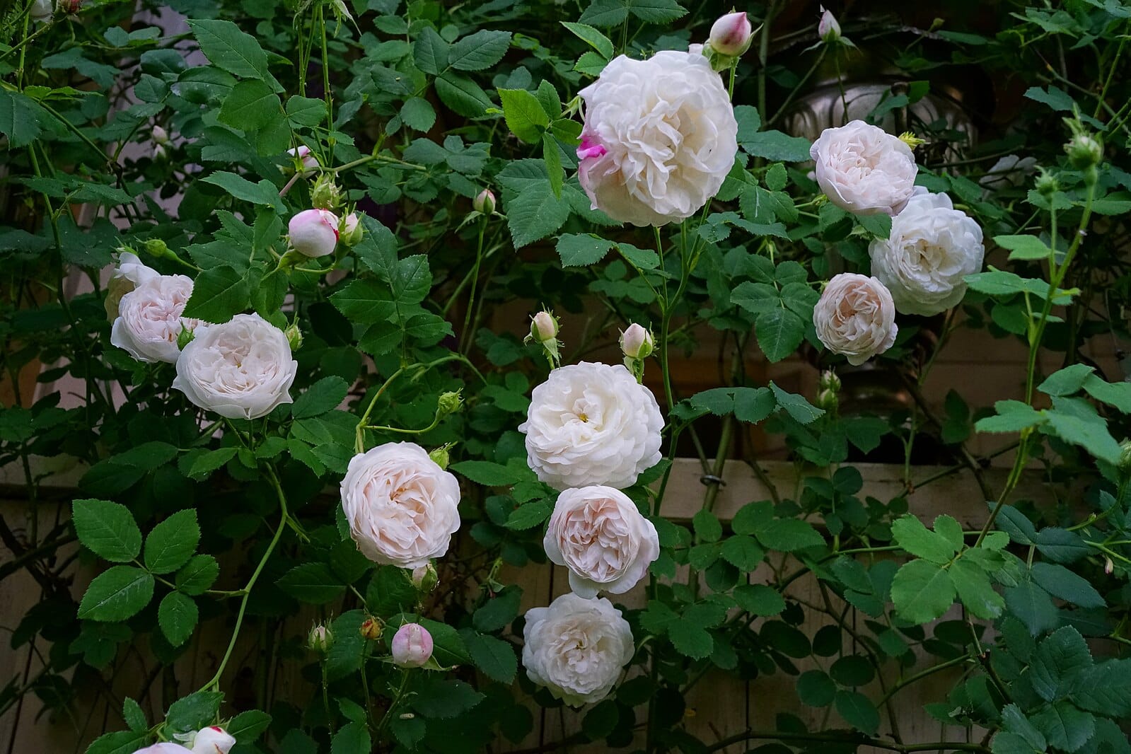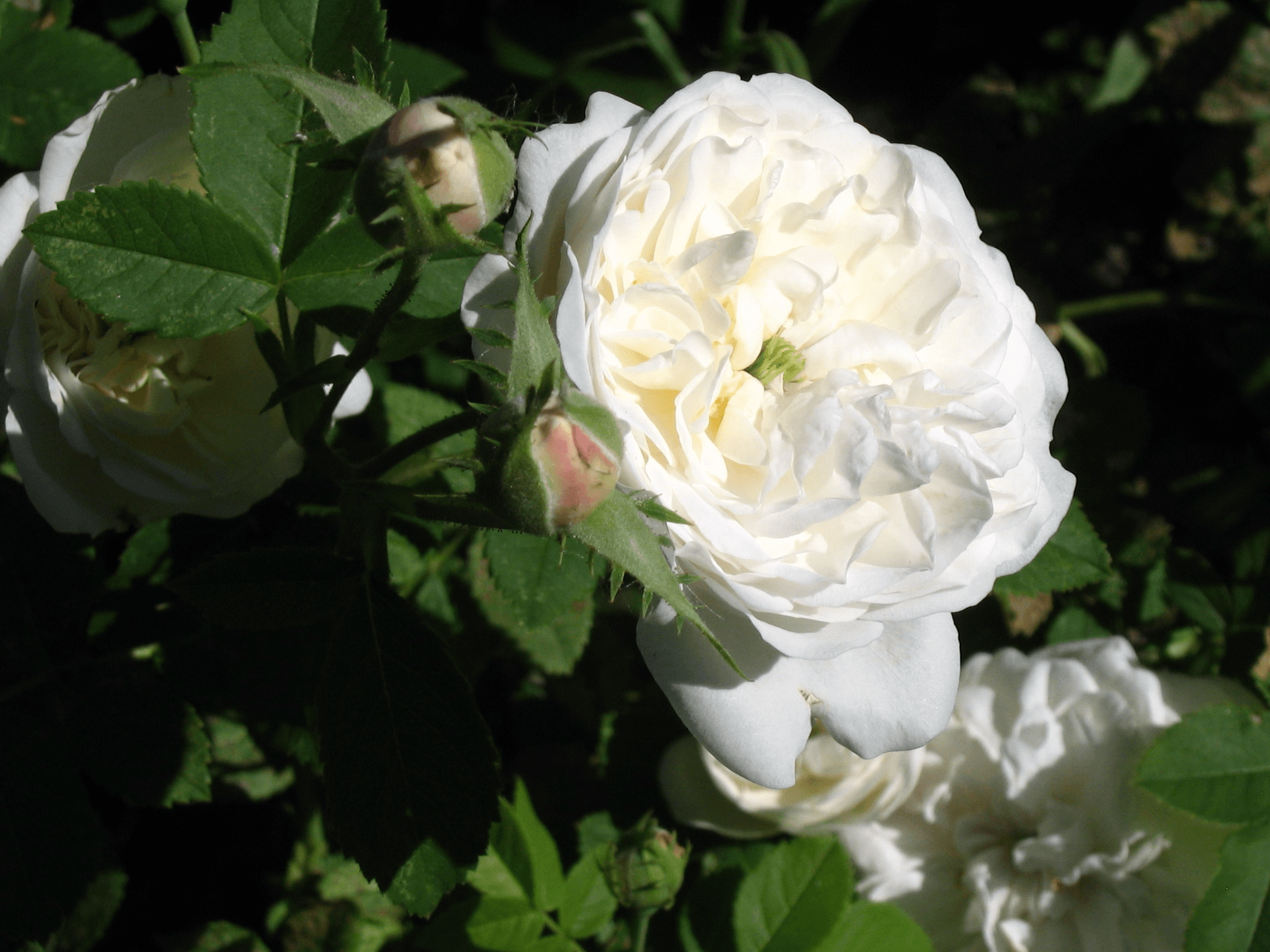 Mme Plantier (Rosa Alba) får stora klasar med tätt fyllda, snövita blommor som ofta har ett litet grönt öga i mitten. Knopparna kan ha en svag rosa ton innan de slår ut.