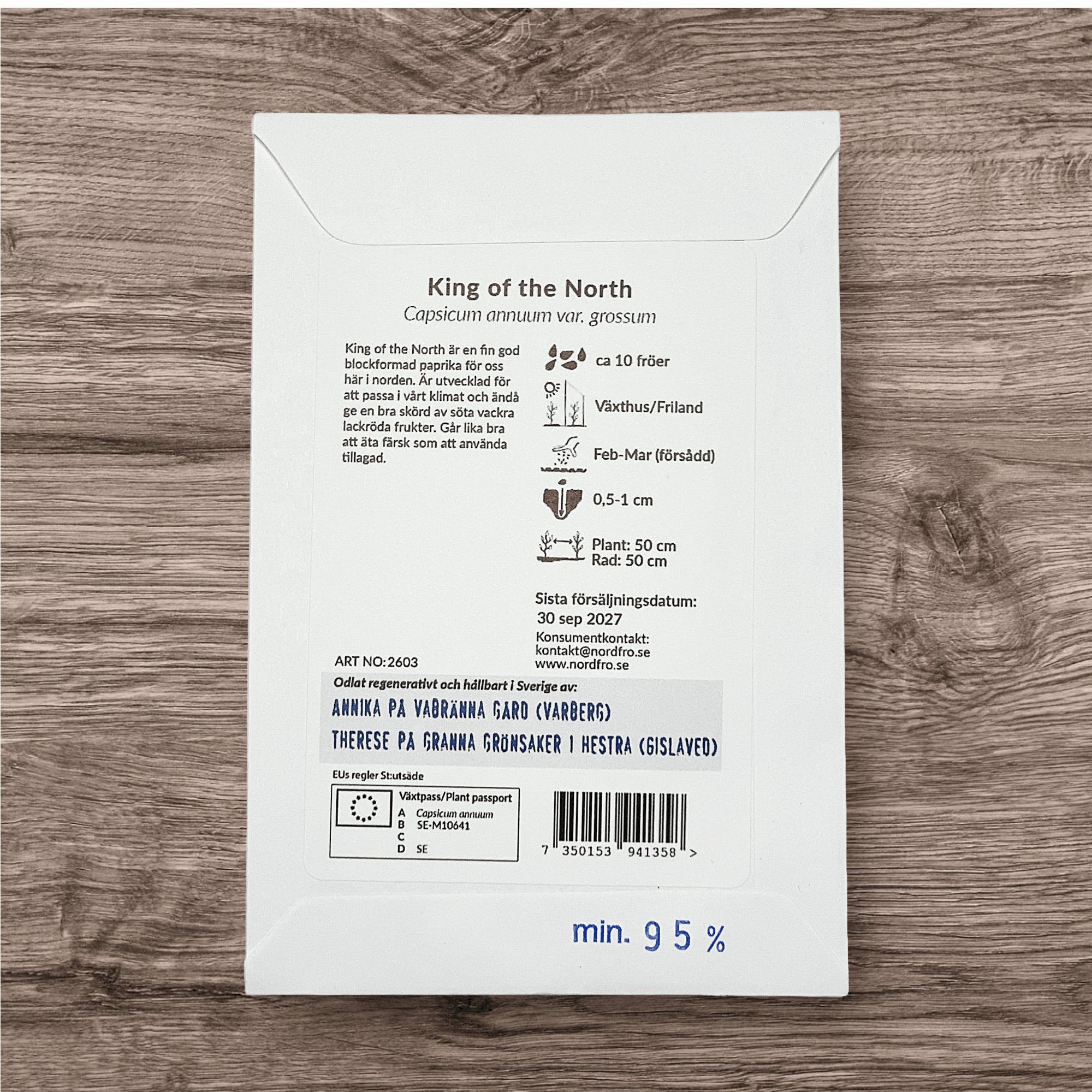 Paprika King of North är en fin god blockformad paprika för oss här i norden. Är utvecklad för att passa i vårt klimat och ändå ge en bra skörd av söta vackra lackröda frukter. Går lika bra att äta färsk som att använda tillagad.