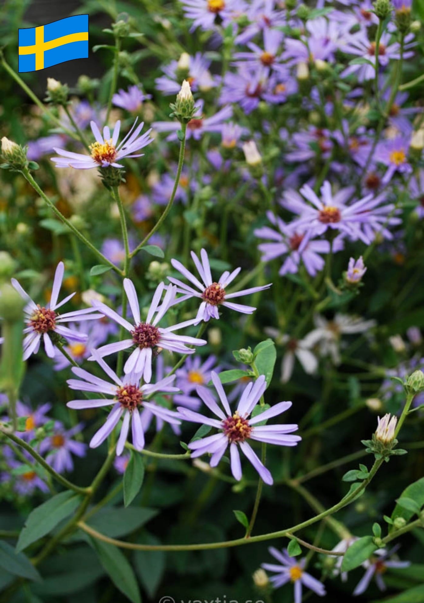 Eurybia x harveyi ’Twilight eller storbladig aster, är en tålig och uppskattad höstperenn. Den blommar rikligt från augusti till september med ljust blåvioletta eller lavendelblå blommor med en gul mitt. Blommorna sitter i platta klasar på mörka, stabila stjälkar vilket gör den bra till snitt.