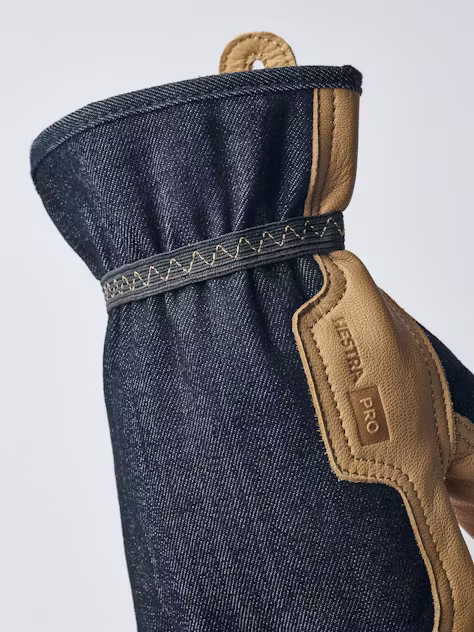 Tillverkad i slitstarkt getskinn med förstärkta fingrar och tumme. Ovandel i denim. Resår runt hela handleden håller handsken på plats. Upphängningsöglor.